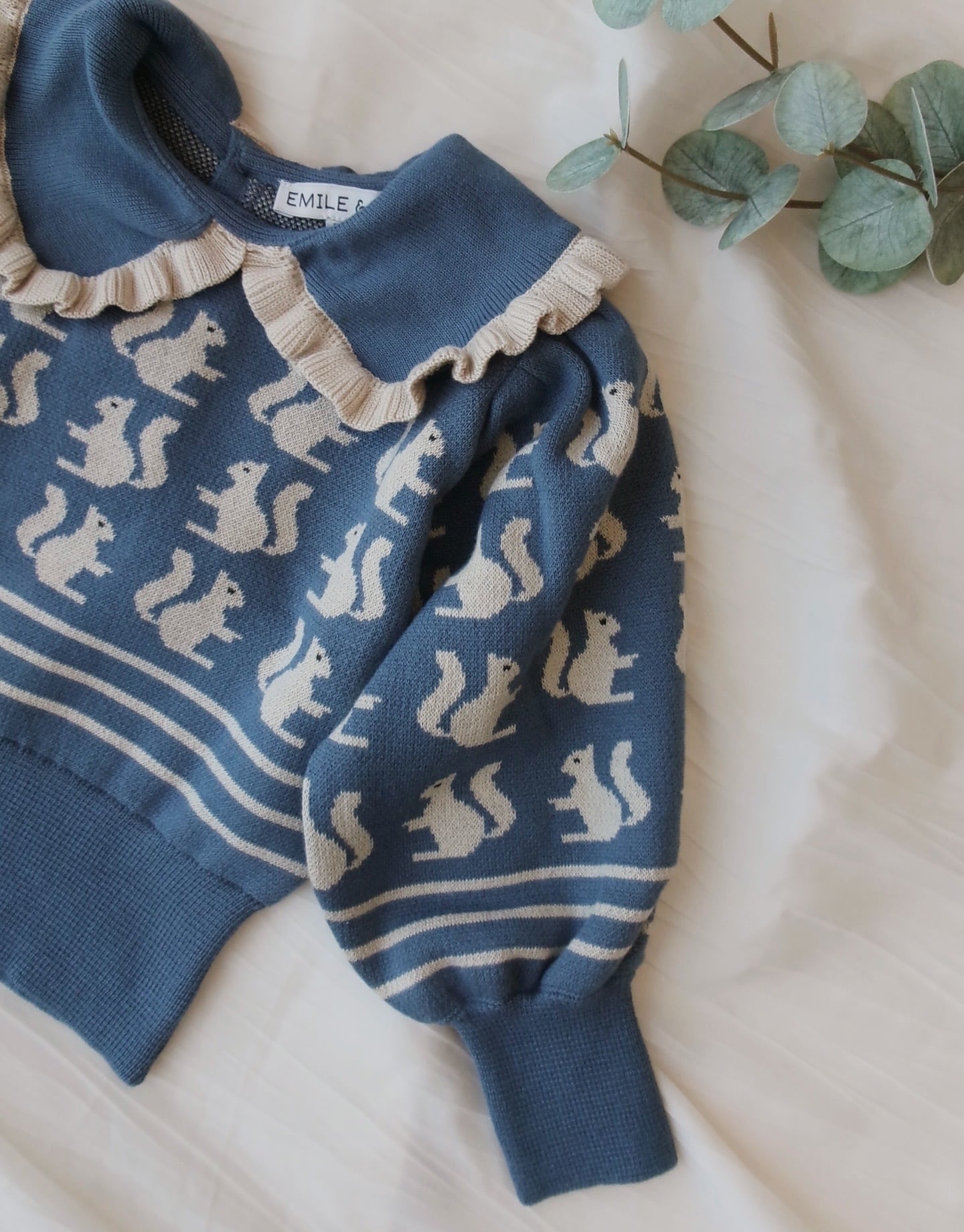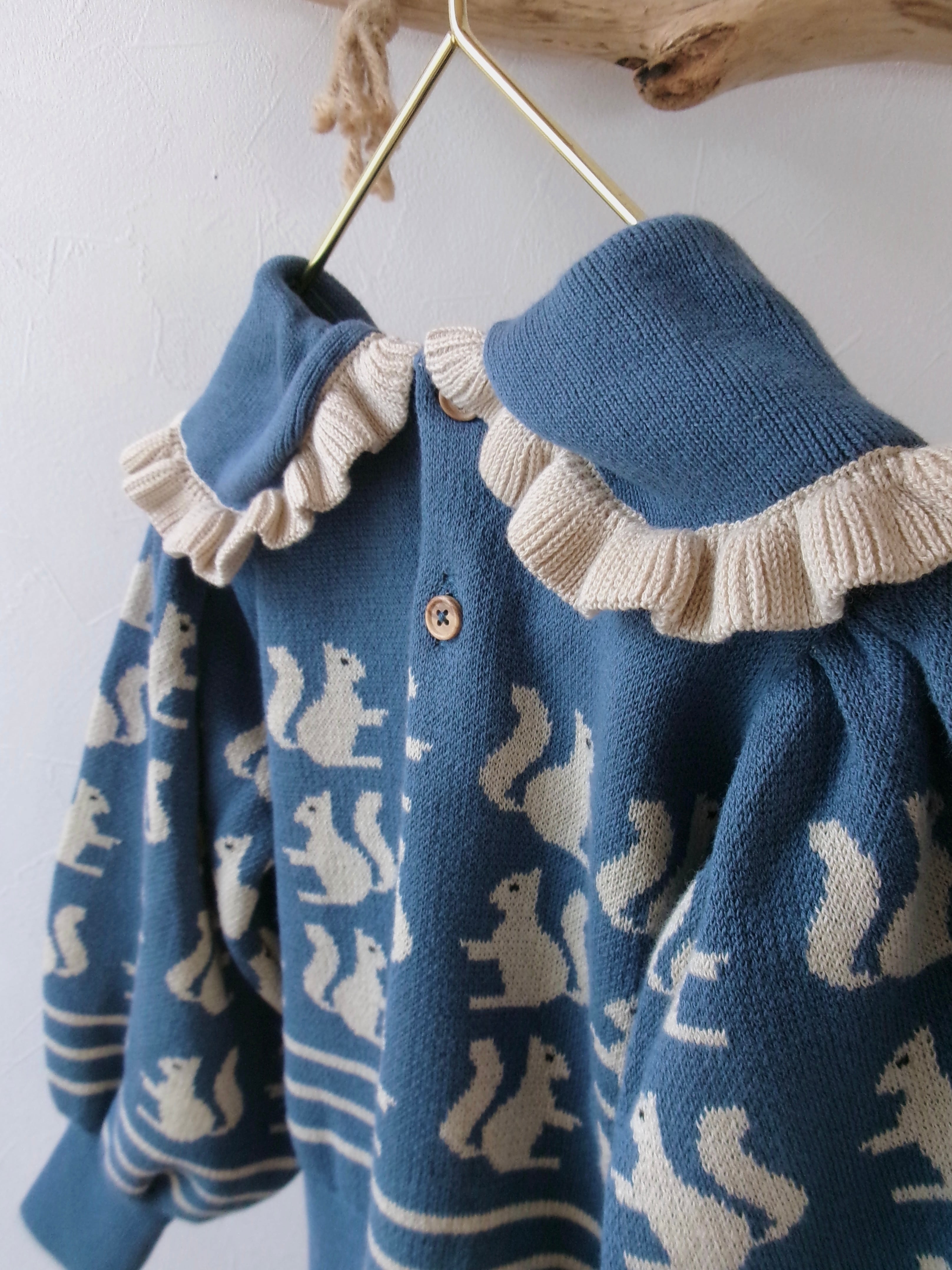 ブルーのオーガニックコットンを使用したリス柄ジャカードセーター。丸首の襟元は、エクリュ色のフリルで縁取られているキュートなデザイン。広めのワイドスリーブ袖が特徴で、シルエットもきれいな1着です。