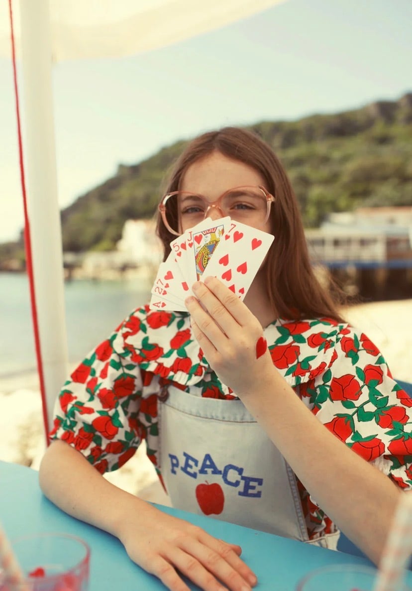 エクリュ地に広がる赤いローズプリントが、どこかヴィンテージを感じさせるクラシックな雰囲気。一枚で華やかさがありながら、上品にまとまるデザイン。
