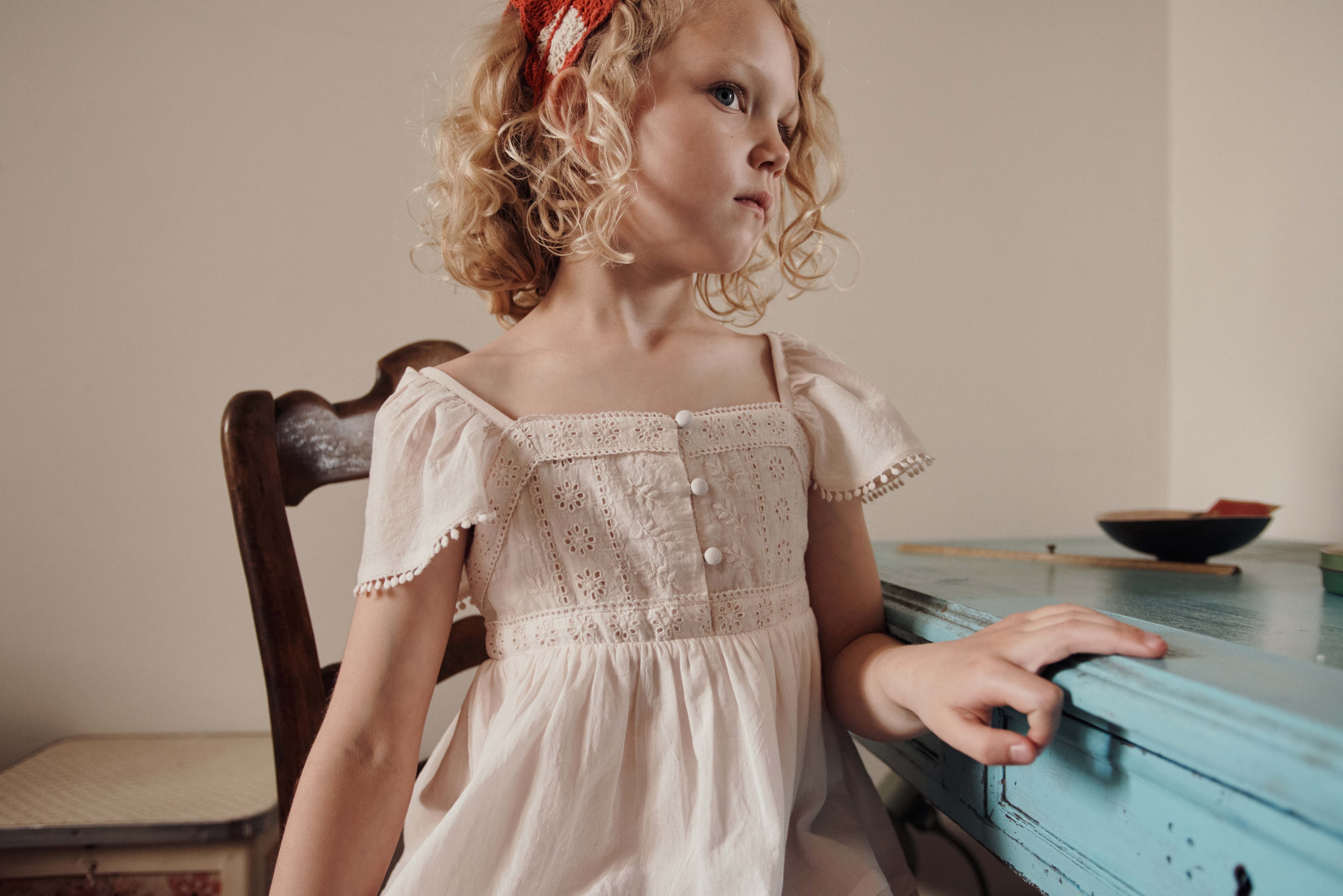 ほんのりピンクがかったクリームクリームカラーのコットン生地に、ブロデリー・アングレーズ(穴あきの刺繍)をあしらったワンピース。肩の裾には小さなポンポン付きのフリルも施され、繊細な刺繍が映える上品な一枚です。