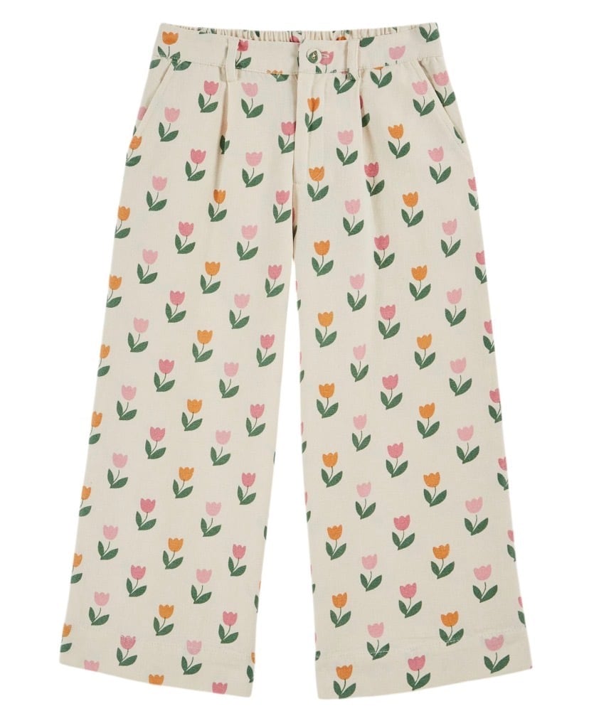 クリーム色のコットンキャンバスに、ピンクとオレンジのチューリップ柄を全面プリントしたルーズシルエットパンツ。