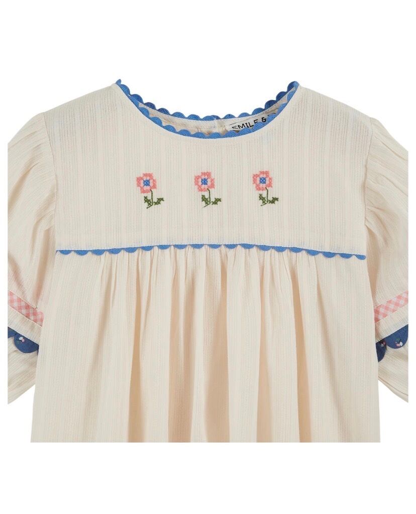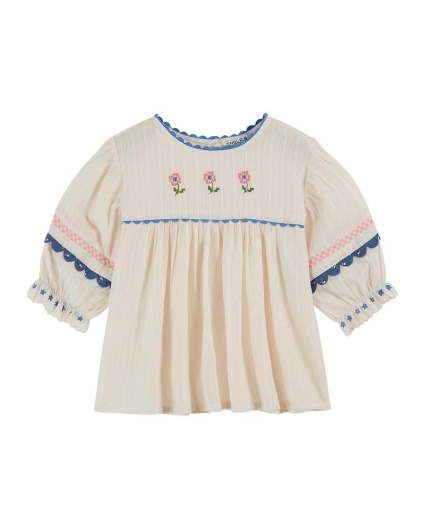クロスステッチの花刺繍や、細部までこだわりのあるディテールデザインが特徴のブラウス。